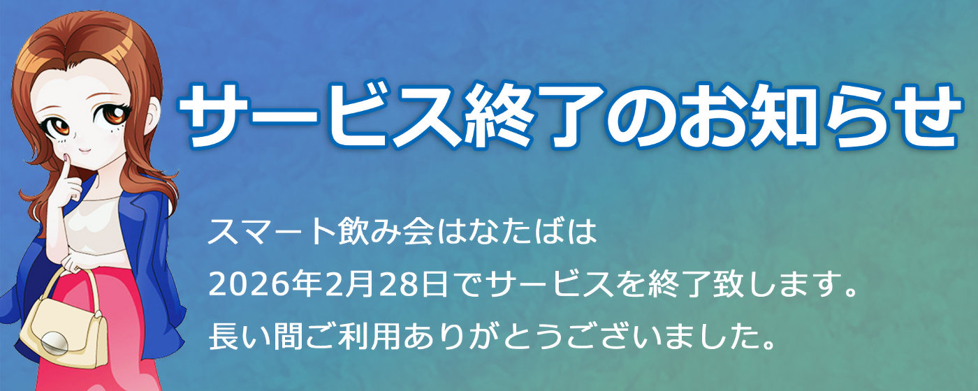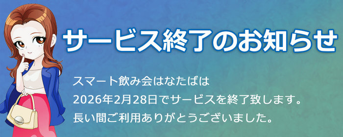 ご利用ありがとうございます。 スマート飲み会はなたばは 2月28日をもってサービス終了 となります。 現在保有されているポイントは、サービス終了と同時にすべて失効となります。 期限までにぜひご利用ください。 長い間スマート飲み会 はなたばをご利用いただきましてありがとうございました。