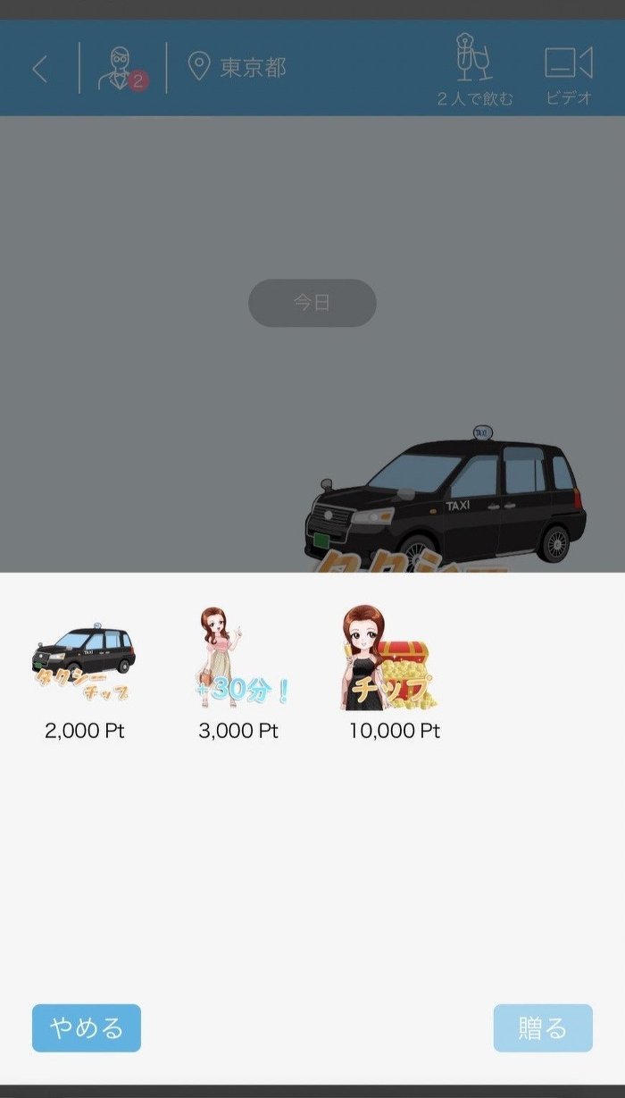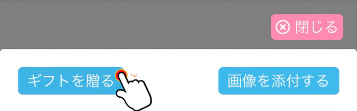 男性用ページ、各キャストとのメッセージページからギフトスタンプをタップ後、【贈る】ボタンをタップするとギフトスタンプが送信されます。